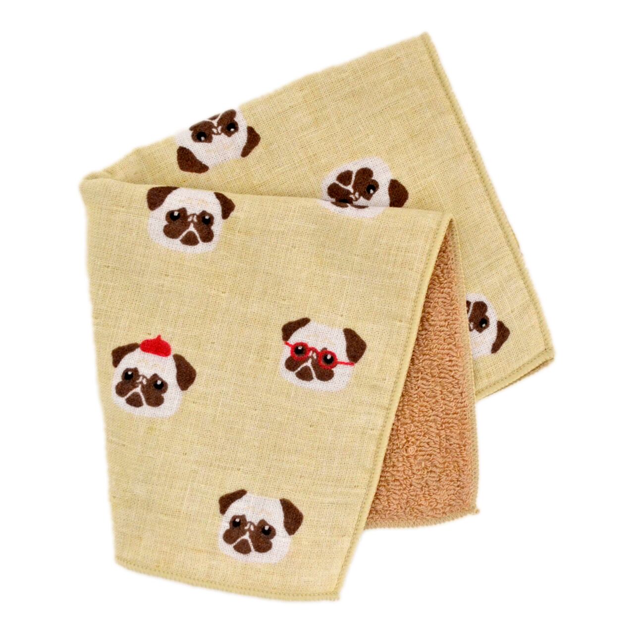 やわらかいガーゼと吸水性の良いパイルの二重織の生地に、画伯のようなベレー帽や赤ぶち眼鏡をかけたパグちゃんがプリントされたタオルハンカチです。