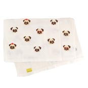 画伯のようなベレー帽や赤ぶち眼鏡でおしゃれを楽しんでいるパグちゃんのプリントも印象的です。